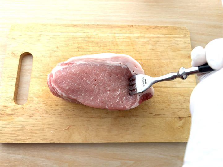 豚肩ロースブロック肉は、下の画像のように両面にフォークなどを使って穴を開けます。