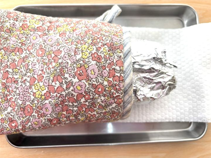さらにミトン(無い場合はタオル)でくるみ、20分放置して余熱で火を通していきます。