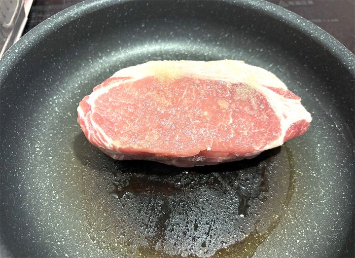 熱したフライパンにオリーブオイルを入れたら、1の肉を入れて全体に焼き目をつけていきます。
