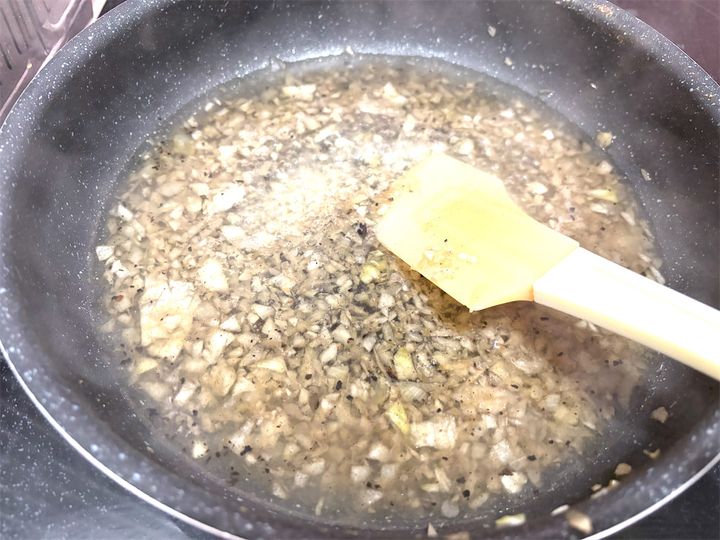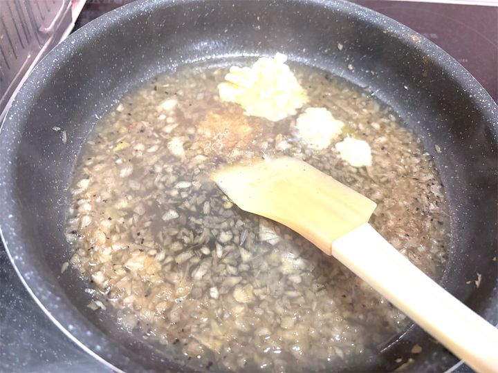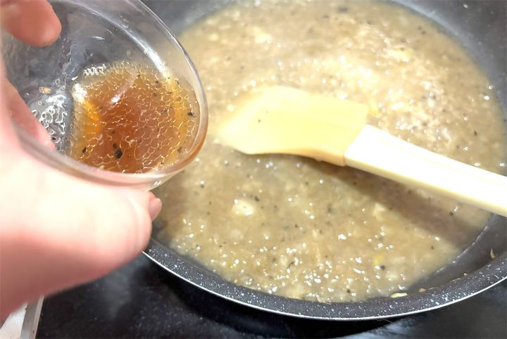 2から出てきた肉汁と黒こしょう、パセリを加えて、ソースが完成です。