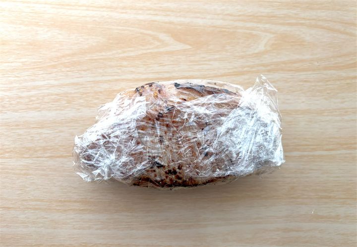そのあと、下の画像のように肉をラップでくるみ、電子レンジ600Wで3分10秒温めます。
