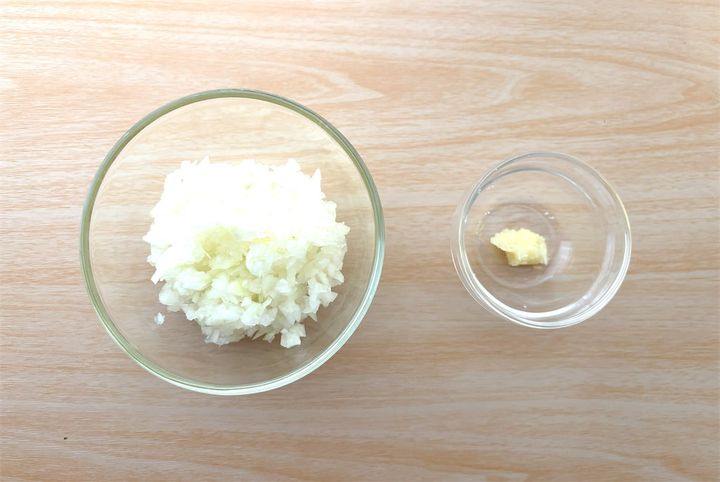 玉ねぎはみじん切り、にんにくはすりおろしておきます。