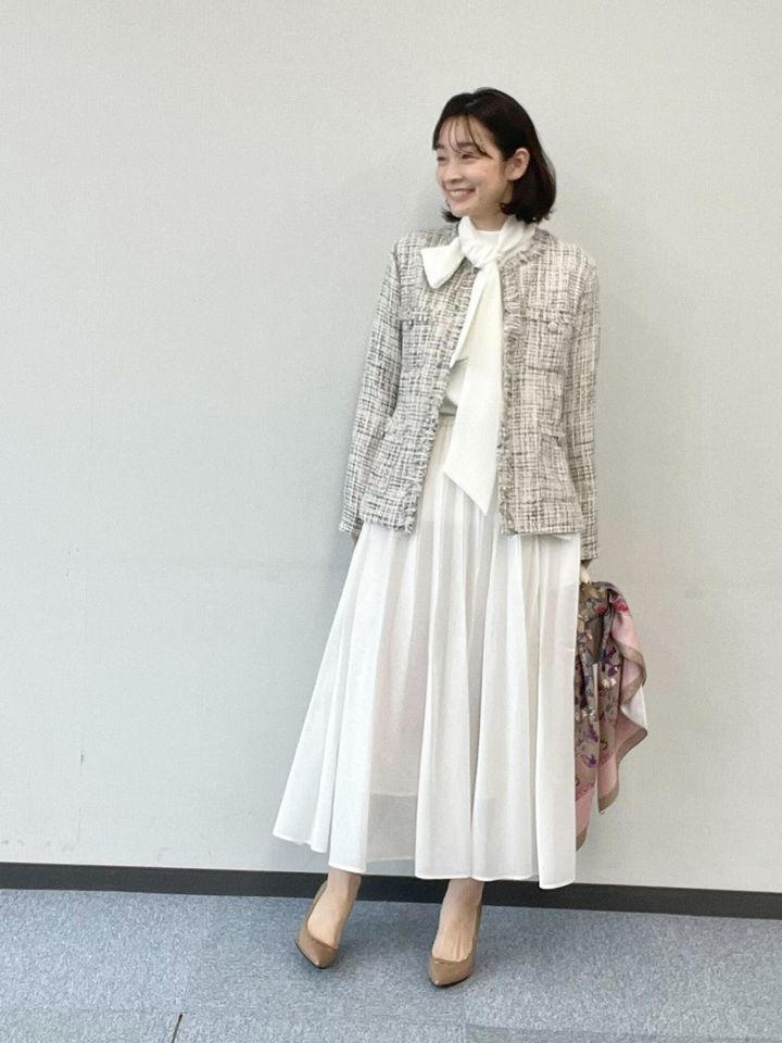 軽やかに織られたツイードジャケットが華やかかつ上品なホワイトコーデ。淡い水色の糸が織り込まれたアイボリーカラーは、春らしい爽やかさを演出します。オールホワイトにまとめて卒入学らしい印象に。ジャケットの黒糸も活かしながら小物をブラックで統一することで、また違った雰囲気の着こなしも楽しめます。