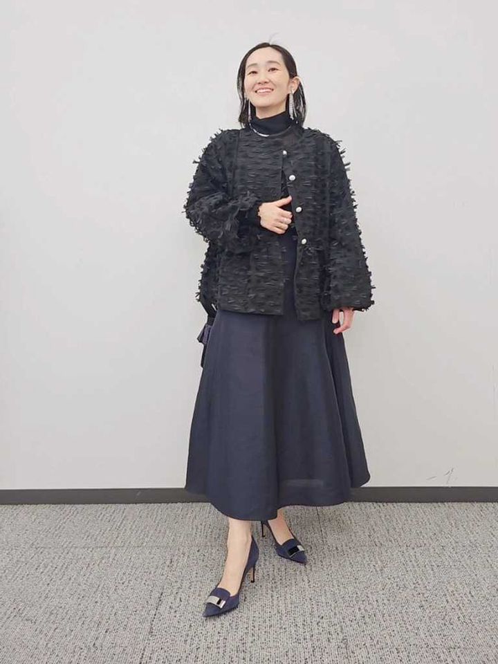 シックなブラックジャケットに透け感のあるカットソーをイン。他はネイビーまとめで上品な着こなしに整えました。ブラックでも適度なフェミニンさが絶妙な甘ニッシュさを叶えたコーデに。ジャケットはブラウス風にも着回せるのでオケージョン以外のシーンでも活躍間違いなし。後ろのパールボタンがさりげなく華やかさを添えた大人の女性にぴったりな一枚です。