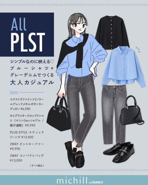 今回は初春にぴったりな爽やかな着こなしをご提案。PLSTの「タイプライタークロップドシャツ」と人気のキレイ見えデニムパンツを合わせました。ボトムスと小物がシックな中に、ブルーのシャツがよく映える♡きちんと感もありつつ程よく華やかで、オフィスシーンにもぴったりです。早速コーデの詳細を見ていきましょう♪