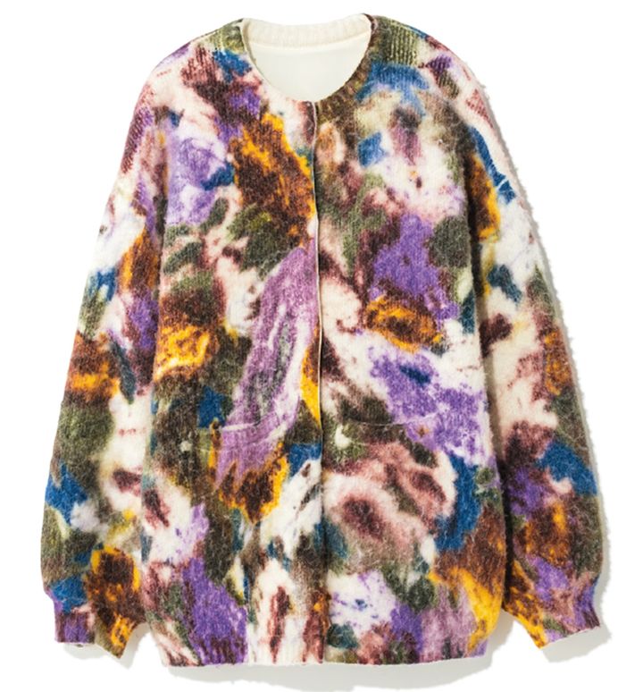 シャギー素材にアートのような花柄をプリントしたカーディガン。裏地付きで型崩れしにくく、ニット特有のチクチク感が気にならないのも嬉しいポイント。