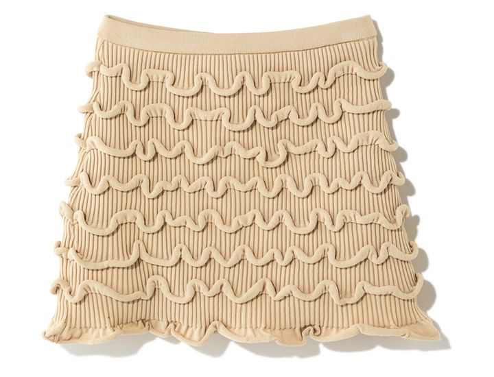 軽量で伸縮性に優れたアモッサ糸で編まれたニットスカート。1枚で着ても、パンツとレイヤードしてもかわいい。ダークネイビーもあり。