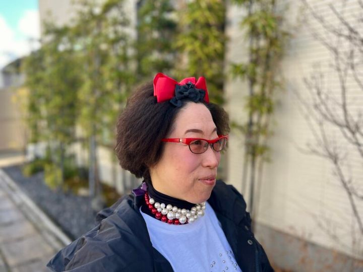 印象的な個性派メガネに負けないヘアクリップとチョーカー。「身長が低いので、このヘアクリップは私のアイコンです」。重ね付けしたコットンパールのチョーカーは、クリエイターズサイトでオーダーメイドしたもの。