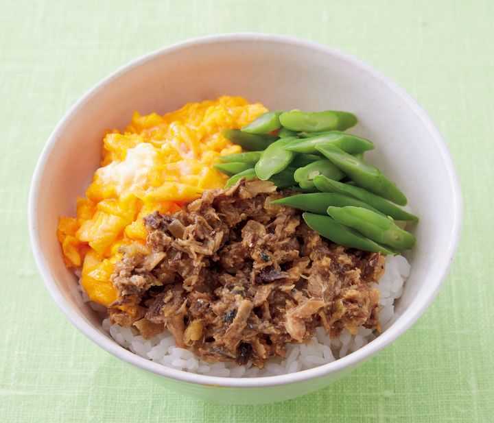 温かいご飯にいり卵、ゆでて斜め切りにしたさやいんげんとともにのせて。