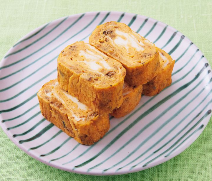 卵3個にさばみそそぼろ大さじ1の割合で加え、卵焼きに。
