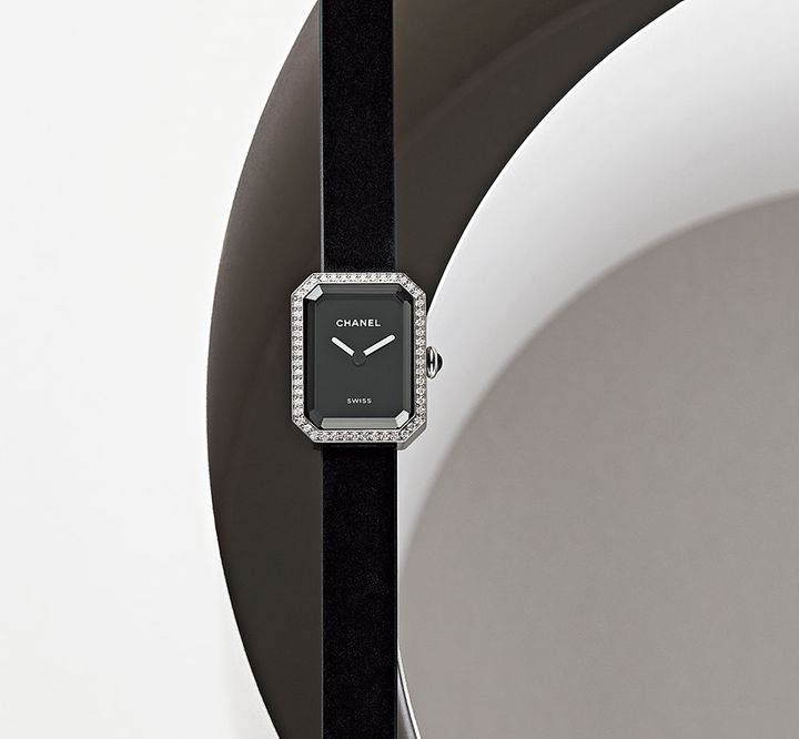 小ぶりでも絶対的な存在感心躍るダイヤモンドベゼル。『繊細なダイヤモンドがプルミエール独特の八角形のベゼルを縁取り、そのシルエットを強調。小ぶりでもはっと目を引く時計です。黒と白のツートーンがシックで大人』(竹村はま子さん)