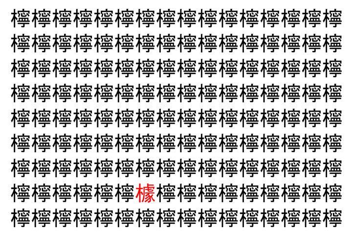 画像の中には、「檸」という漢字が縦に9行、横に16個並んでいます。 全部で144個となりますが・・・、そのうち1つは「異なる漢字」となってますよ!!