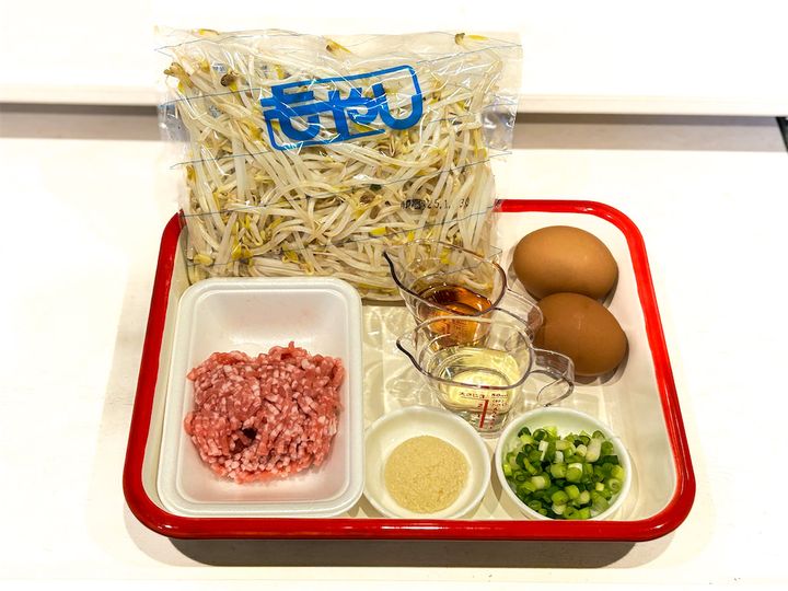 用意する材料は、卵、もやし、豚ひき肉、青ねぎとどれもスーパーで簡単に手に入るものばかりです。味付けも、みりん、しょうゆ、砂糖とシンプル。