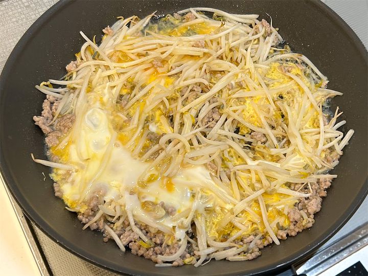 3. 【爆速10分】で「もやしの卵とじ」出来た!主役のもやしはシャキッ!豚ミンチにとろとろ卵絡んで堪らん♡