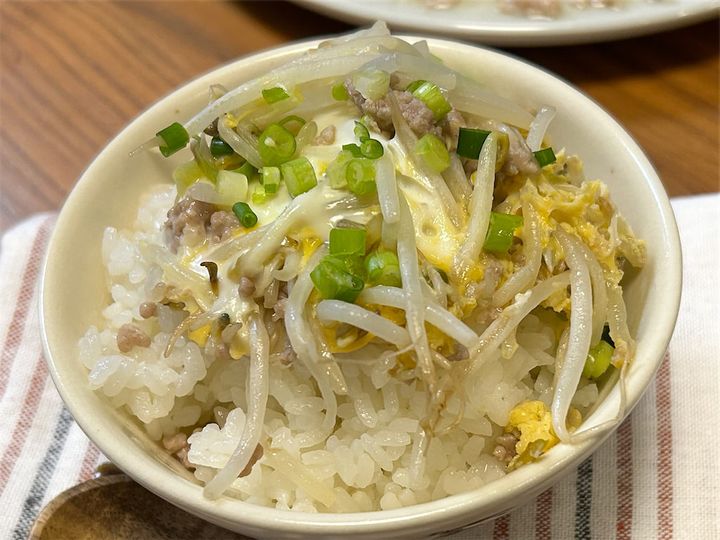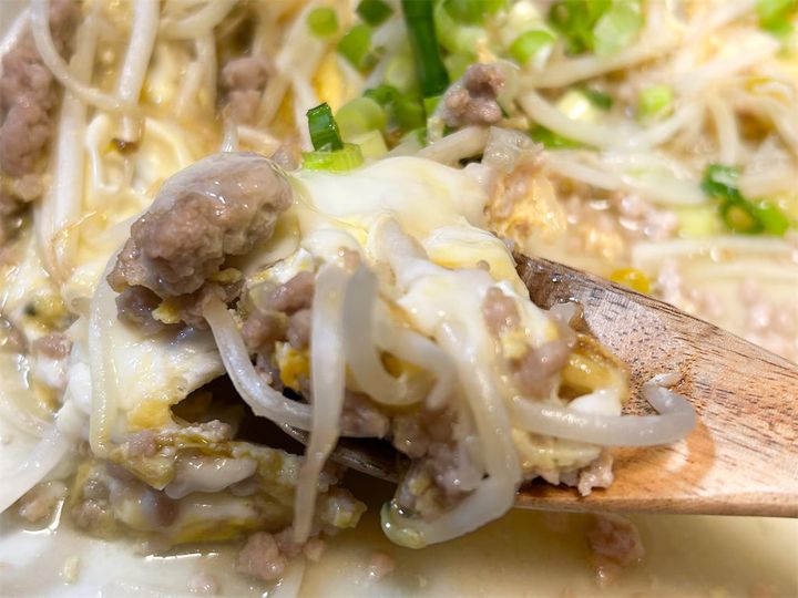 シャキシャキとしたもやしの食感と豚ひき肉のジューシーな旨味、そして卵のやさしさが沁みる~♡