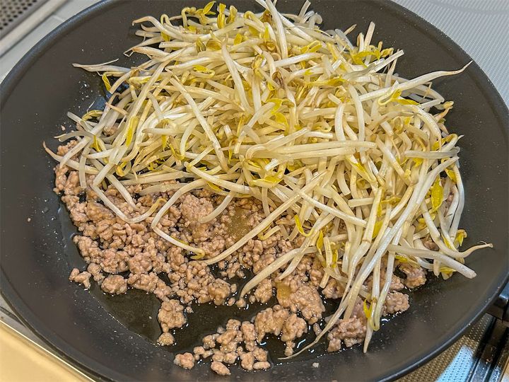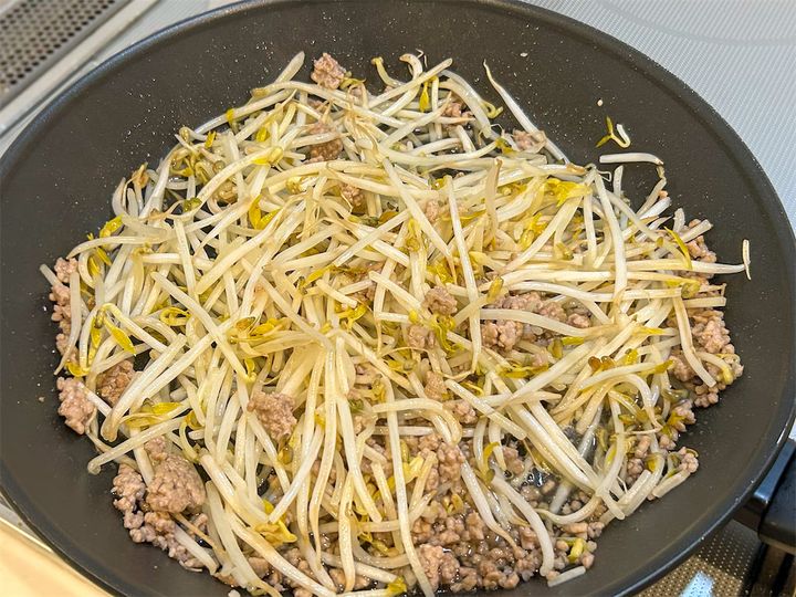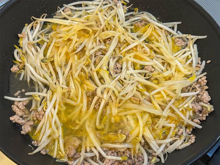4. 豚ひき肉に火が通ったところで、みりん、しょうゆ、砂糖、そして2のもやしを投入!一気に入れちゃいました!