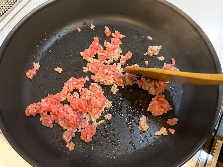 3. フライパンに油(分量外・適量)を引いて中火で熱し、フライパンが温まったら、豚ひき肉をほぐしながら炒めていきます。