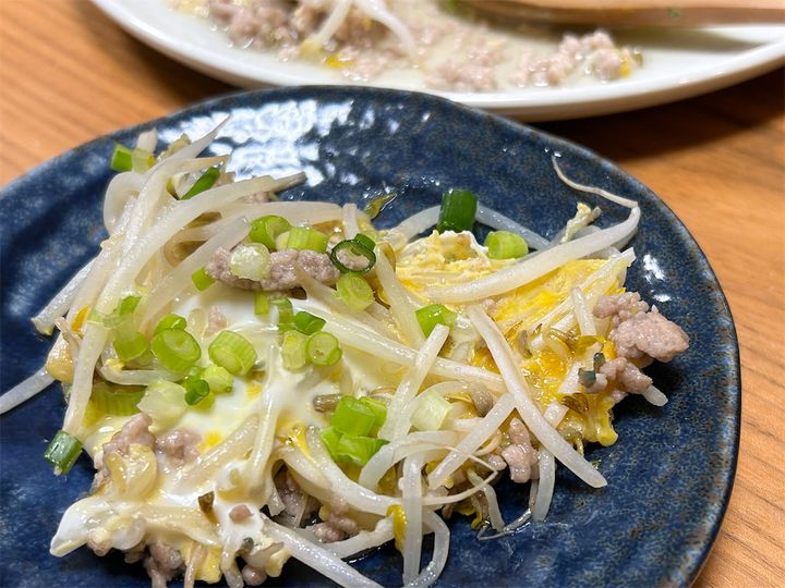 「もやしの卵とじ」が完成しました!かっちゃんさんのように上手には作れませんでしたが、たっぷりのもやしとひき肉に、トロッとした卵が合わさっておいしそう。