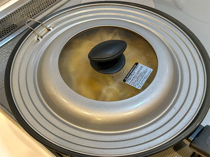 7. フライパンにフタをしたら、お好みの火の通り具合まで加熱するだけ!初めての調理だったので、卵が固まりすぎないよう慎重に、弱火で3分程度加熱しました。