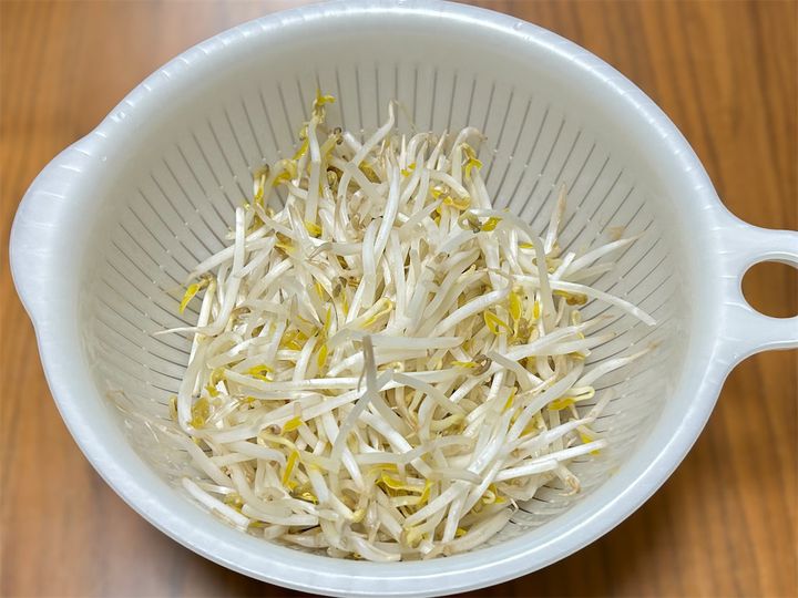 2. もやしを袋から取り出し、水でさっと洗います。洗えたらザルにあけて、水気をしっかりと切っておきましょう。