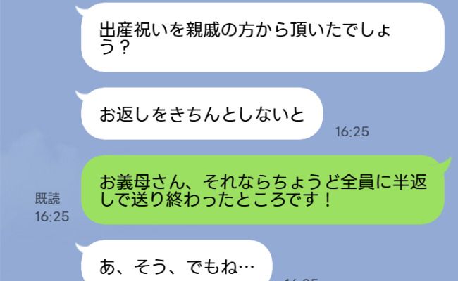 出産祝いのお返しを気にする義母に「全員に返しました!」と私。「でもね…」義母が私に説教する理由は