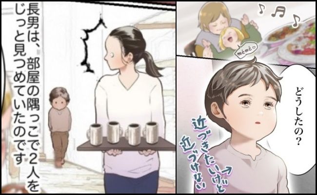 ある食事会で、いつも長男をかわいがってくれている知人のおばあちゃんがいました。そのおばあちゃんは、久しぶりに会った孫娘を膝の上に乗せて歌を歌ったり抱きしめたりしていたのですが、長男は「2人が楽しそうだから、近づきたいけど近づけない」といった表情をしていて、2人の様子を部屋の隅っこでじっと見つめていたのです。そんな長男の様子を見て驚いた私は「どうしたの?」と聞いてみました。