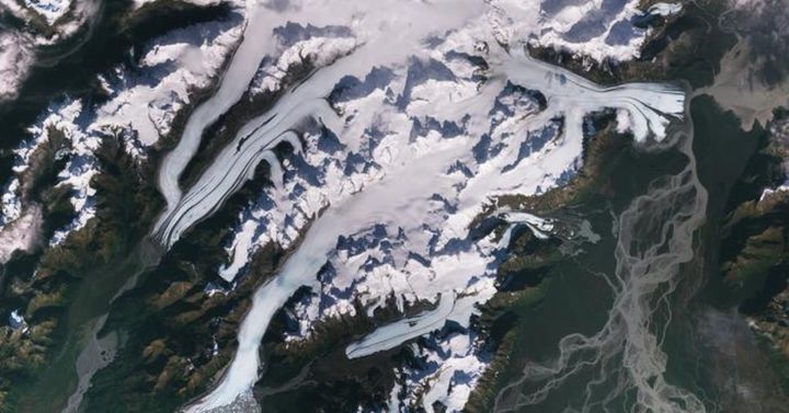 2017年の画像。アラスカのチュガッチ山脈の氷河。氷河が溶けて湖や川に水が流れ込んでいる / Credit:Copernicus Sentinel data 2017_Melting glaciers increase loss of freshwater resources and rise global sea levels(2025, EurekAlert)