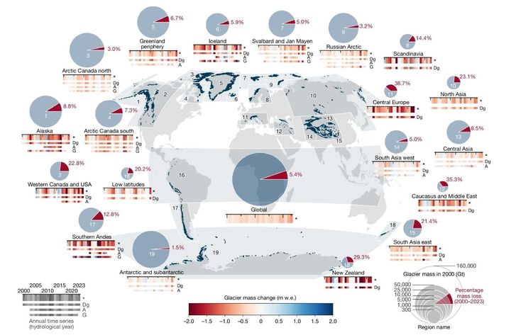 2000年から2023年までの世界全体の氷河質量の変化 / Credit:GlaMBIE, Nature(2025)