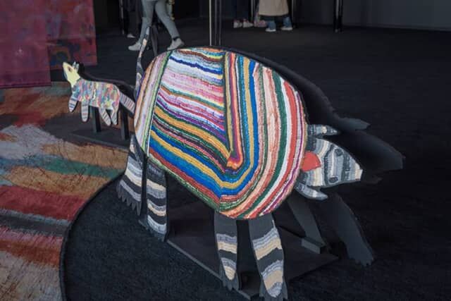 天井から吊るされたタペストリーや床の敷物など、豊かな色彩や自由な発想は知的障害を持つ作家の特徴のひとつです。