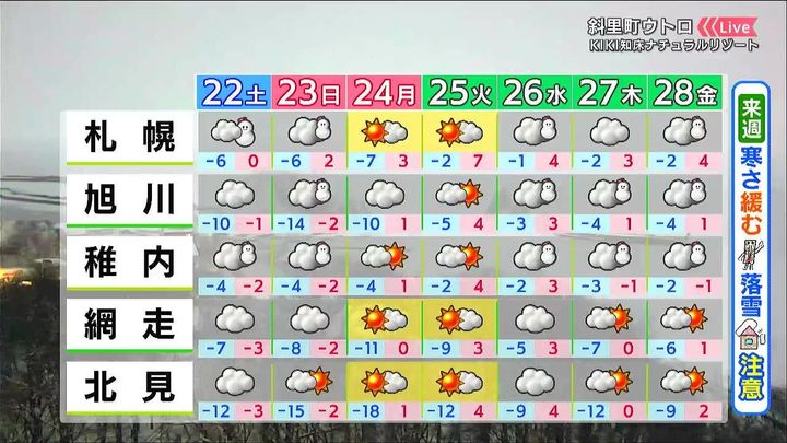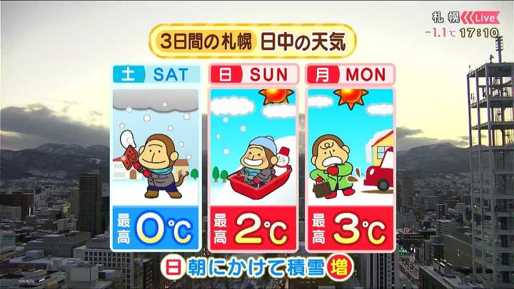 日曜は旭川でも雪が降りますが、降り方は弱いでしょう。月曜と火曜は広く晴れて、火曜日の最高気温は札幌で7度など各地でプラスです。落雪に注意して下さい。