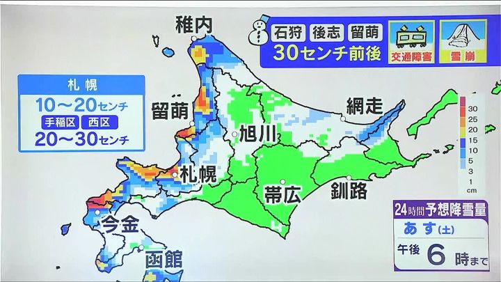 あす22日(土)にかけて北風が続き、同じような場所で雪が降ります。あす午後6時までの24時間予想降雪量を見ると、赤や紫、札幌周辺や後志、留萌地方でさらに30センチ前後の雪が降るでしょう。札幌市内でも手稲区や西区で30センチ近い雪、今金町でも10センチ前後降りそうです。交通障害やなだれなどに引き続き注意して下さい。