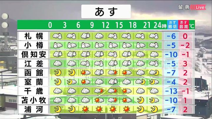 あすの時間ごとの天気。道央・道南からです。