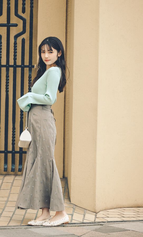 レディの定番、マーメイドスカートも、今季注目のフレア袖ニットソーと合わせれば旬なシルエットに。色合いでも今っぽさを加速させて。