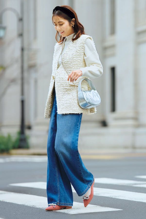ジレ(ブローチ付き)¥29,700/アルページュストーリー ニット¥4,398/grove デニムパンツ¥19,800/マイストラーダ バッグ¥6,490/カシュカシュ(アンビリオン) ソックス¥880/ドット フクスケ(福助) カチューシャ¥59,400/acca(acca GINZA SIX店) イヤリング¥25,300/Grosse(グロッセ・ジャパン) シューズ¥7,700/オリエンタルトラフィック(ダブルエー)