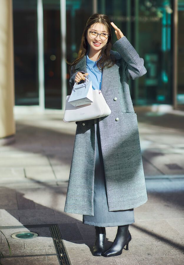 コート¥35,200/MISCH MASCH シャツ¥9,990/PLST スカート¥25,300/マルモア(DMC) イヤリング¥121,000/ヴァンドーム青山(ヴァンドーム青山本店) 紫外線カットメガネ¥8,800/Zoff バッグ¥60,500/ケイト・スペード ニューヨーク(ケイト・スペード カスタマーサービス) ブーツ¥44,000/銀座かねまつ(銀座かねまつ6丁目本店)