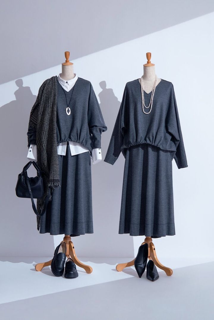 (右)プルオーバー¥30,800、スカート¥35,200/ともにモガ、ネックレス¥16,500/レキップ、シューズ¥23,100/プレインピープル(プレインピープル 青山) (左)プルオーバー、スカートは右と同じ、シャツブラウス¥30,800/モガ、ストール¥26,400、ネックレス¥15,400、バッグ¥41,800、シューズ¥35,200/すべてレキップ