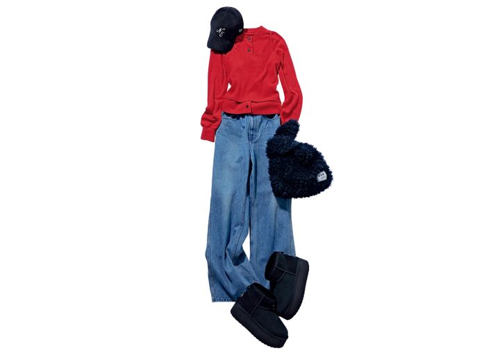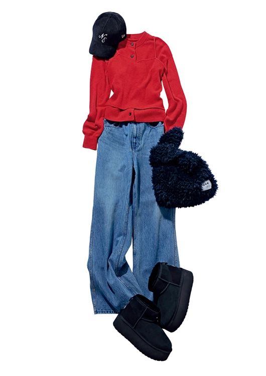 ニット&ビスチェSET[セット販売]¥25,300/ノーブル(ノーブル有楽町マルイ店) デニムパンツ¥30,800/157woadblue(ヤマツゥ) ボアバッグ¥12,100/スリードッツ(スリードッツ表参道店) ムートンブーツ¥24,200/エミュ(ル タロン 有楽町マルイ店) キャップ¥4,180/ニューエラ