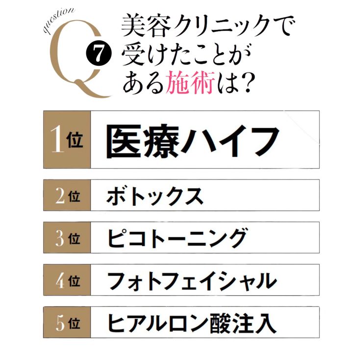フェイスラインをすっきりさせるために医療ハイフを受けたことがあるという人が最も多かった。次いでおでこのシワやエラ対策にボトックスが人気という結果に。シミや美白対策にピコトーニング、フォトフェイシャルを定期的に受けるという人も。ヒアルロン酸注入や、糸リフトにクマ取りも気になって、積極的に友人と情報交換。