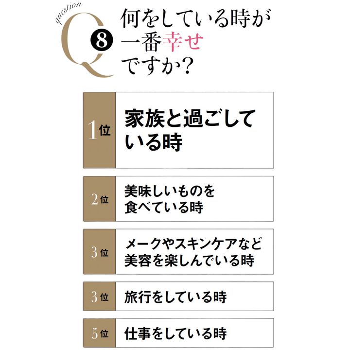 「家族や友人など大好きな人と一緒にお話をしながらワイワイや美味しいものを食べている時」「子供を寝かしつけた後に“明日はどんなメイクにしよう?”と考えてワクワクしている時」「新しく購入したスキンケアアイテムを使用した翌朝の肌の調子がとてもよかった時」と、日々の生活の中でふとした瞬間に幸せを感じることが多いそう。