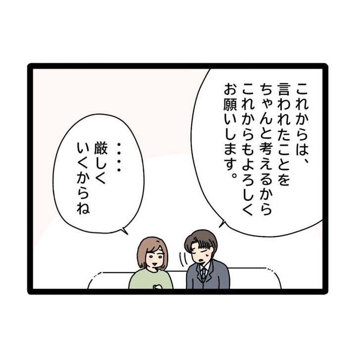 学さんが「これからは、言われたことをちゃんと考えるから・・。これからもよろしくお願いします」と言うと奈々子さんは「・・・厳しくいくからね」と答えました。