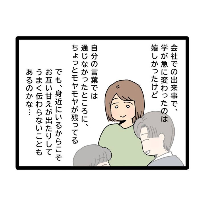 「会社の出来事で学が急に変わったのはうれしかったけど・・自分の言葉では通じなかったところにちょっとモヤモヤが残ってる・・・でも、身近にいるからこそ、お互い甘えが出たりして、うまく伝わらないこともあるのかな」とそんな風に思っていました。