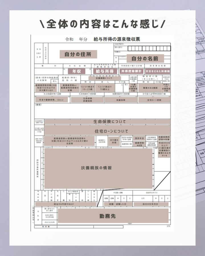 源泉徴収票の全体の内容はこのような感じです。税金に関する単語は漢字が多かったり、ややこしい言い回しだったりしますが、きちんと理解すれば実は難しいことは書いてないのです。