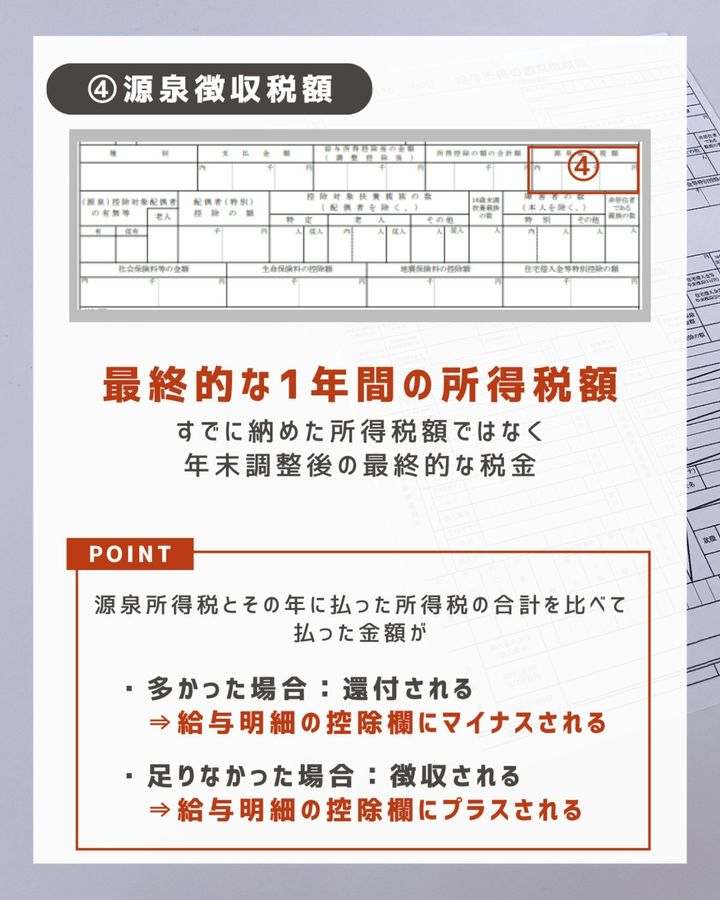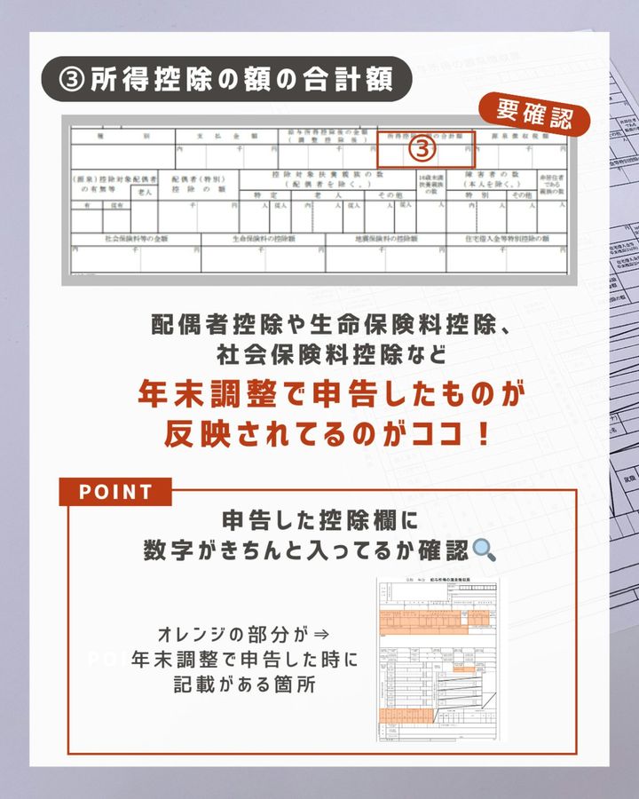 画像のオレンジの部分には、年末調整で申告した内容が記載されるため、この部分もあわせて確認することが大切です。