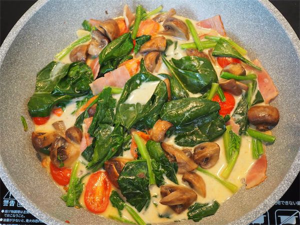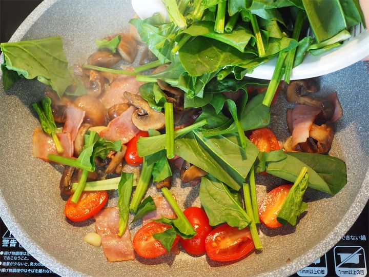 火を通し続けるので、トマトもほうれん草も軽く炒める程度で良さそうです。