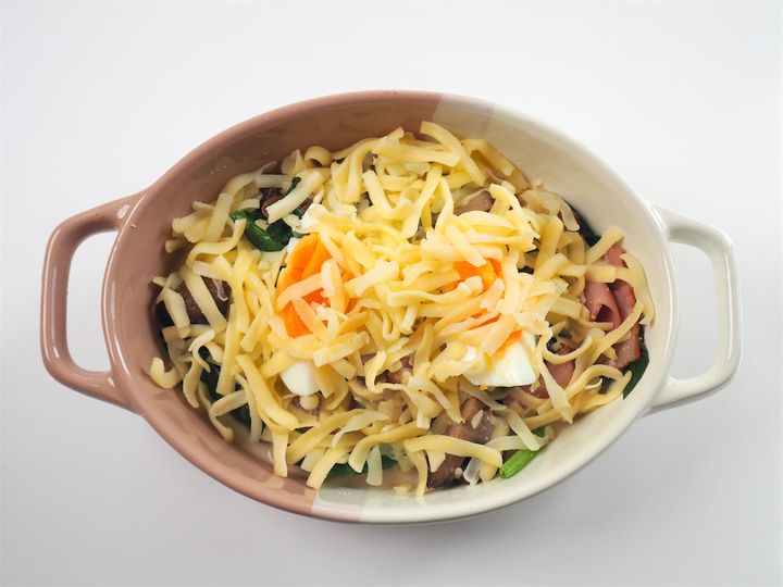 14. バターが溶けたら8のお皿に盛り付け、残りのカットしたゆで卵、チーズをのせたら、トースターでチーズを溶かし焼き色がついたら完成。