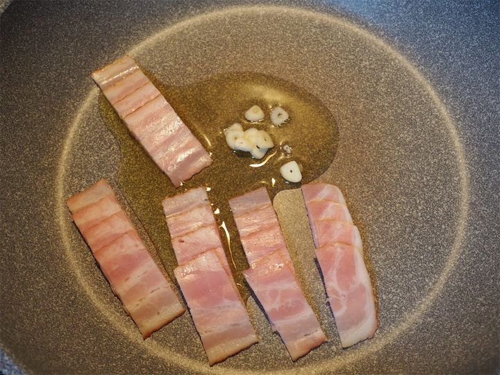 9. フライパンにオリーブオイル、3のベーコン、6のにんにくを入れたら弱火にかける。