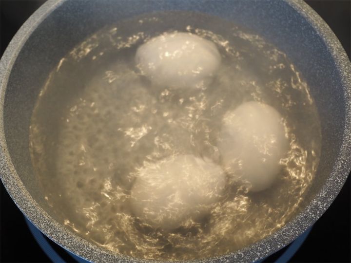 1. 卵を鍋で沸かしたお湯に入れ、7分半ゆでてゆで卵を作る。