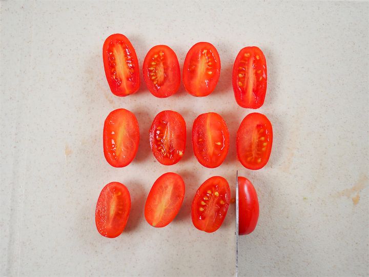 7. ミニトマトを半分に切る。