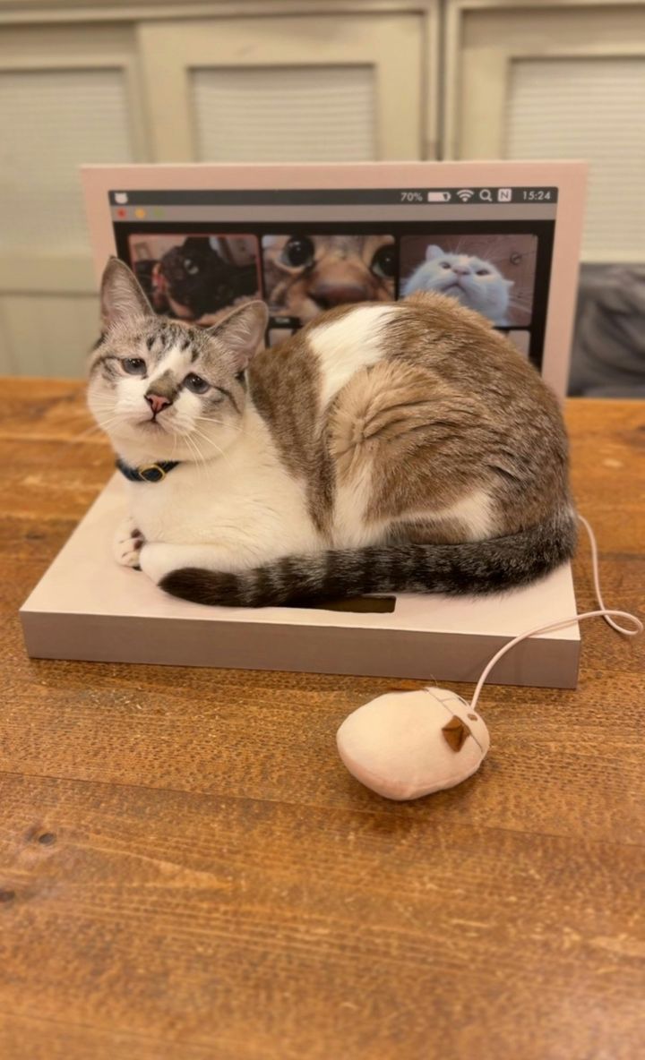 PC型をした猫用爪とぎの商品名は『PC爪とぎ』。飼い主さんが愛猫たちにあげたところ、さっそく猫たちの人気スポットになったようです。マウスがねずみになっているのも手が込んでいてかわいいですね。