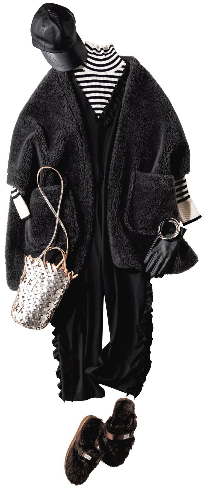 オールインワン¥27,940(ハッシュニュアンス/オンワード樫山)ニット¥15,400(ストラ)ボアストール¥30,800(ハウント/ハウント代官山/ゲストリスト)バッグ¥39,600(メアリーオルターナ/アルアバイル)サンダル¥22,000(スイコック/アンタイトル)キャップ¥9,900(CA4LA/CA4LA プレスルーム)グローブ¥4,990(Gap)バングル¥19,800(アビステ)